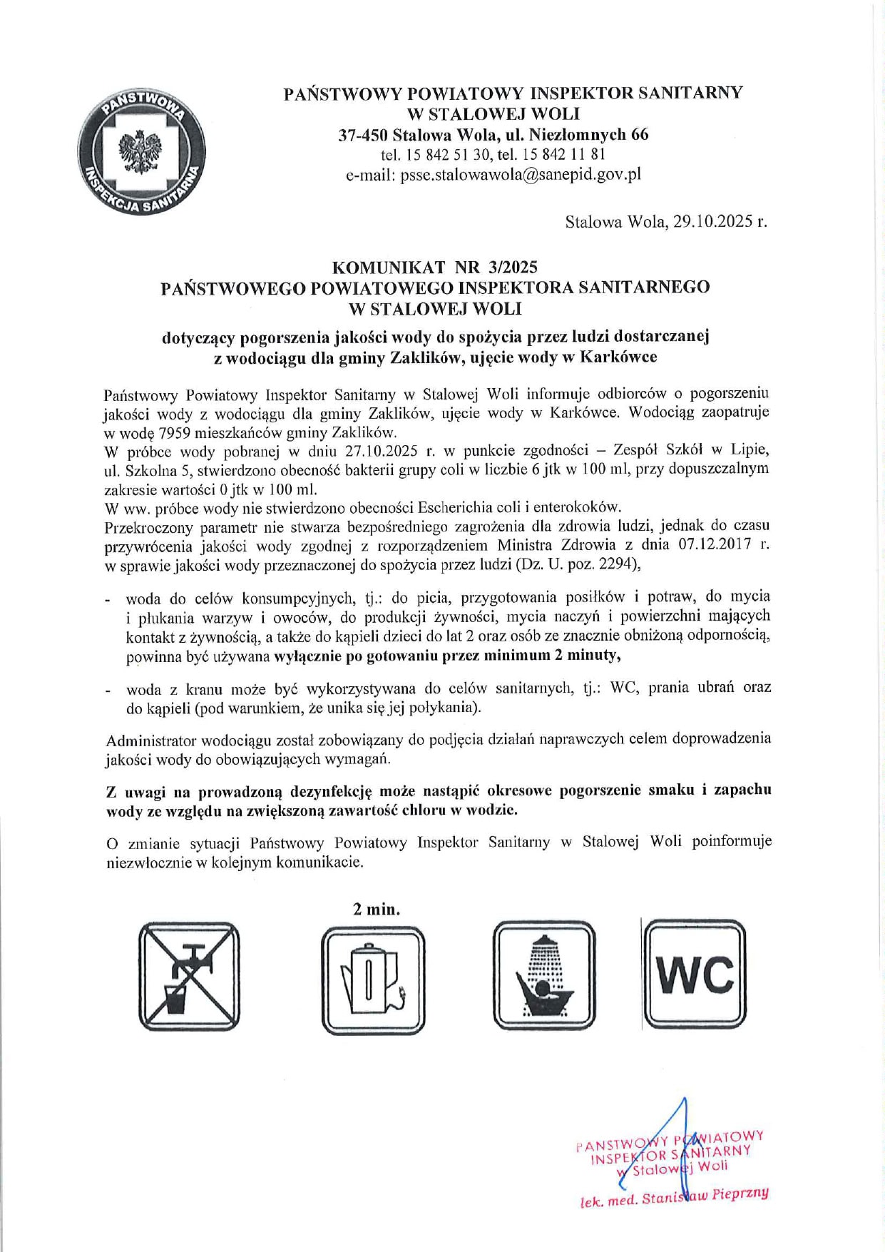 Komunikat PPIS W Stalowej Woli dotyczący pogorszenia jakości wody z wodociągu dla gminy Zaklików z ujęcia wody w Karkówce 30 października 2025 Related posts29 października 2025PSZOK – InformacjaRead more20 października 2025Informacja o przerwie w dostawie wody – GoliszowiecRead more26 września 2025Read more